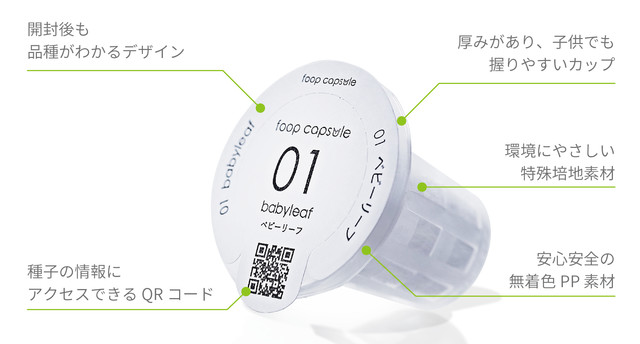 「foop capsule」はアドトロンテクノロジー株式会社が製造、販売するIoT水耕栽培機「foop」をきっかけに誕生した日本メーカー初のカプセル型種子キットです。