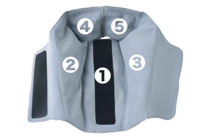 面ファスナーで簡単にサイズ調整ができ、①~⑤の空気層を備えたシンプルな構造。男性でも女性でもぴったりとフィットしやすく、心地よくお使いいただけます。