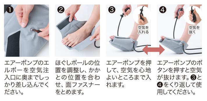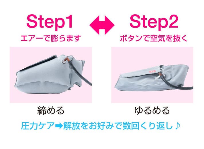 エアーポンプで空気を送り込むだけで、足全体をむぎゅ~っと圧力ケア!空気の量はお好みで調整できるので、心地よいと感じる圧力にあわせてご使用いただけます。