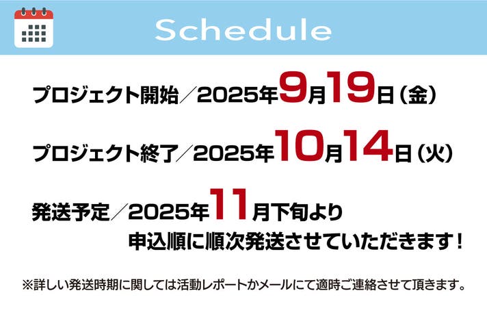 プロジェクト終了後お申し込み順に、順次に発送させていただきます。
