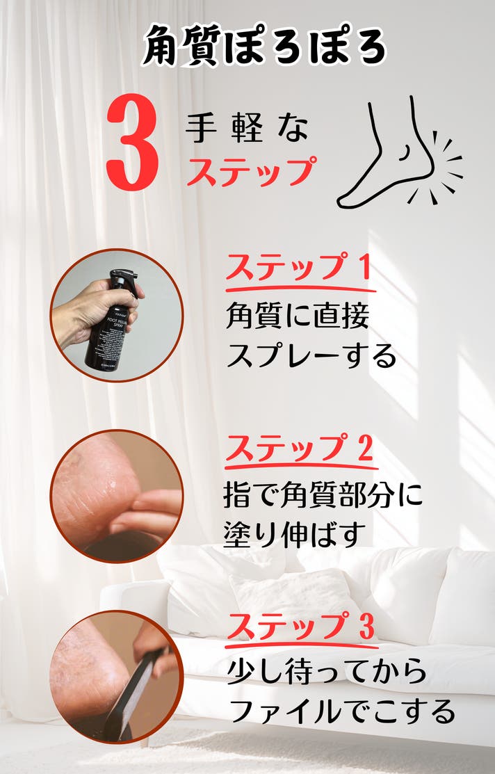 今年も当然訪れる乾燥の季節が来るとかかとや足指廻りのガサガサ感が気になり出します。この商品は、そんなお悩みを解決してくれます。男女問わず気軽に使えるところがとても魅力的で、柔らかくなった角質が専用ファイルによってボロボロ取れていきます。フセラ角質軟化スプレーには保湿成分が入っているので使用後のヒリヒリ感もありません。