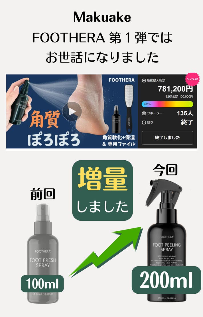 第4弾のフセラ角質軟化保湿ピーリングスプレー&フットファイルではたくさんの応援を頂き心から感謝申し上げます。「なくなったらどうしよう?」「思っていたよりポロポロ角質が取れた!」などの多くの嬉しい称賛の声を頂き前回の100mlボトルから200mlに増量し戻ってまいりました。