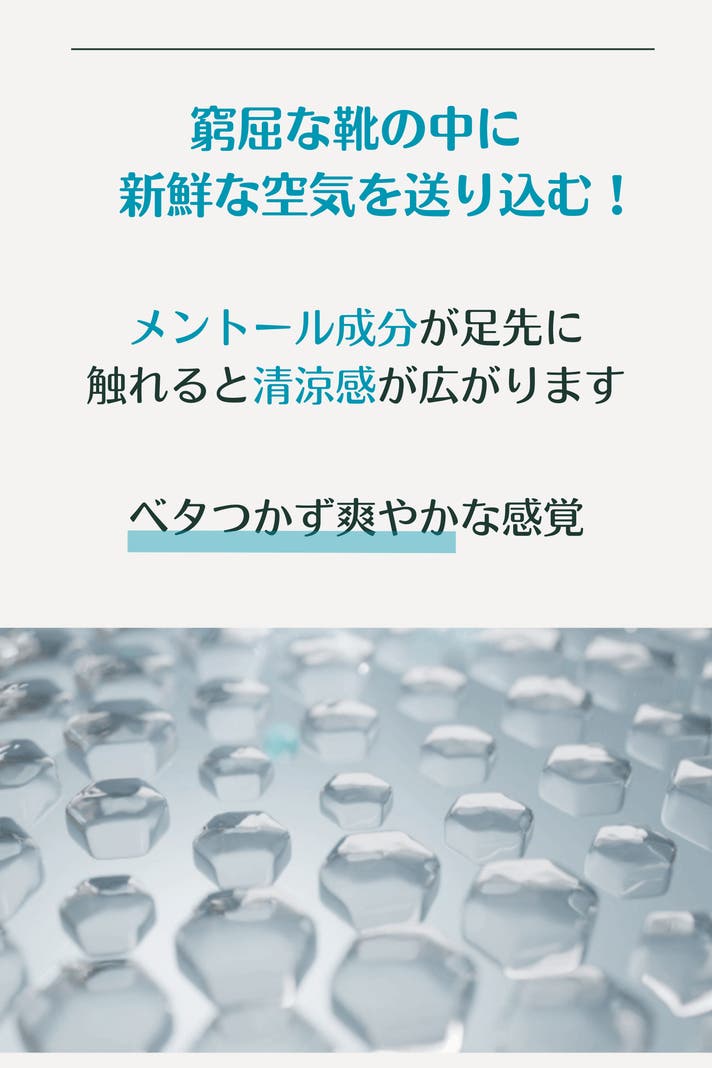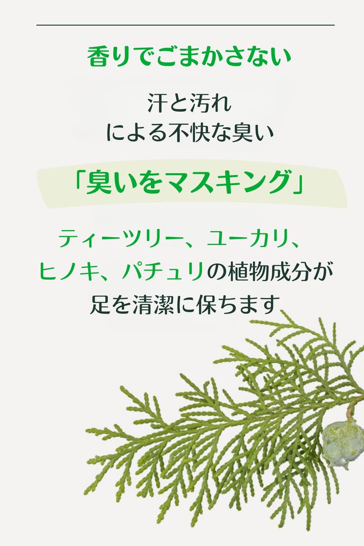 素足にスプレーするとメントール成分がちょっぴりクールな清涼感と植物系の自然の香りで足元をスッキリさせます。