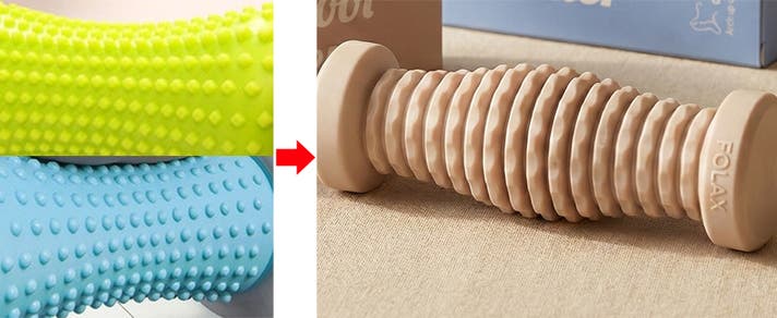 フットローラーは様々な形で製作されています。 自社では円形、ピラミッド型などのローラーを購入し、使用テストを経て既存の突起形態から外れた新しい突起で刺激の範囲が広くなるように鋸歯状に刺激して押す方式の突起を製作しました。