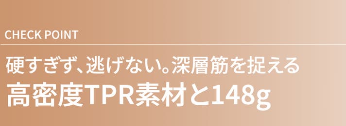 ただ硬いだけのプラスチック製ローラーは、汗で滑りやすく、表面的な痛みが走るだけでした。 本製品は、ゴムの柔軟性とプラスチックの耐久性を併せ持つ「TPR(熱可塑性ゴム)」を採用。