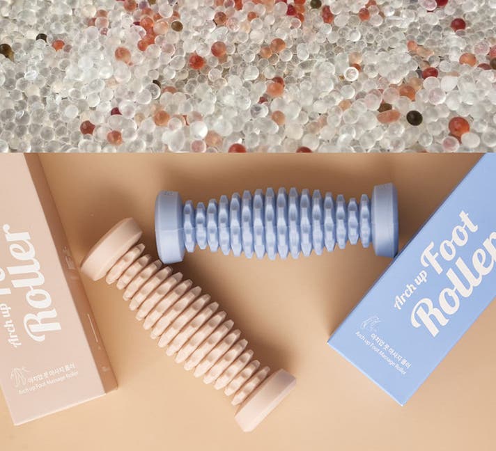 アーチアップフットローラーの素材となるTPRは、熱可塑性ゴム(Thermoplastic Rubber)でプラスチックとゴムの特性を結合したエラストマーです。