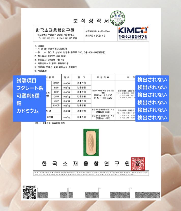 金型から射出したローラーそのまま韓国素材融合研究院に依頼し、フタレート系可塑剤6種、鉛、カドミウム検出可否を確認しました。 テストの結果、まったく検出されませんでした。