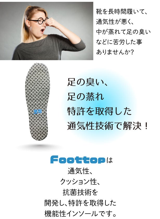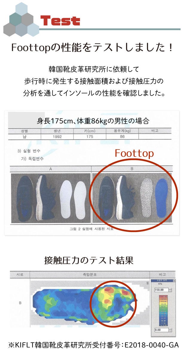 総合病院放射線科に勤務していた開発者自身が、足底膜筋炎を患っており、専門医師の協力を得て、Foottopを開発。販売会社の社長自身も膝が悪く長く歩けず、偶然出会ったFoottopに感激し特許の持ち主に交渉し10年間の製造販売権契約を結び、製造に至る。