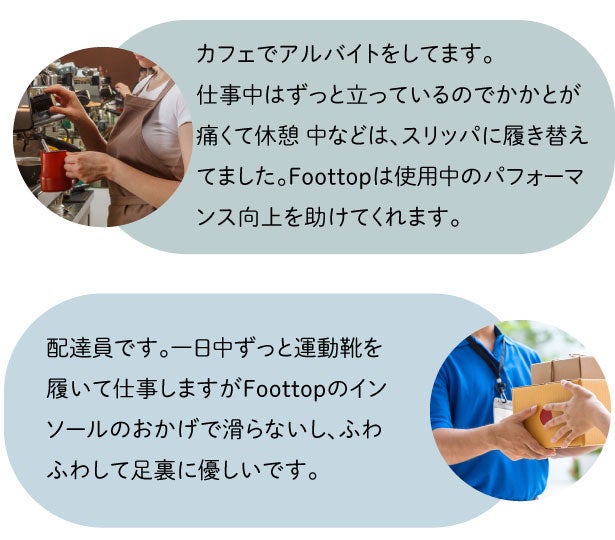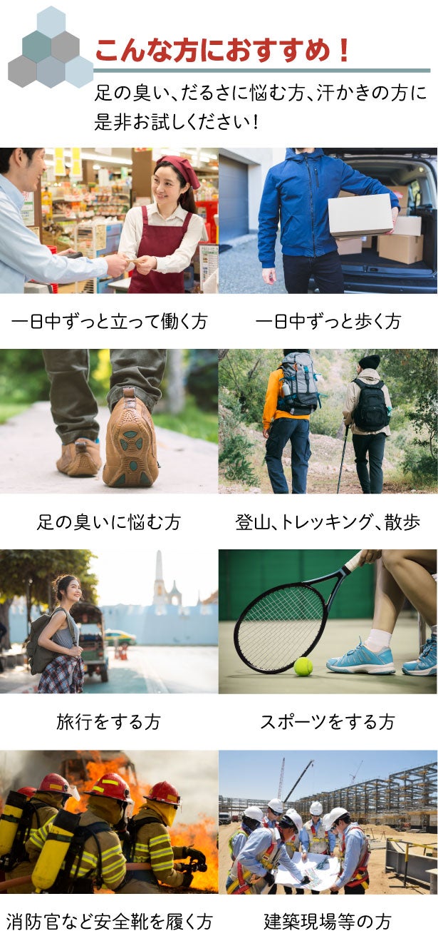 A. 立ち仕事の方、歩く事が多い営業の方、たくさん歩きたいけど疲れやすい方など靴を履いて足に不安や疲れを感じる方におすすめです。