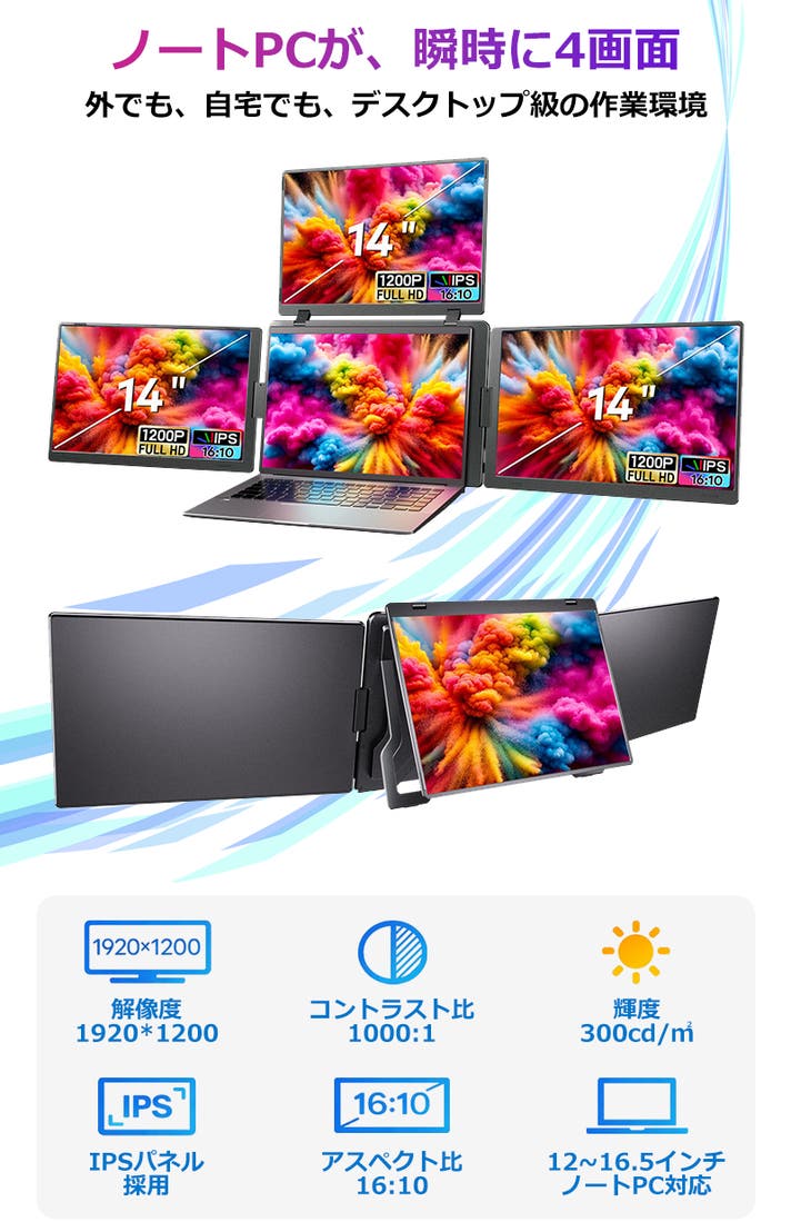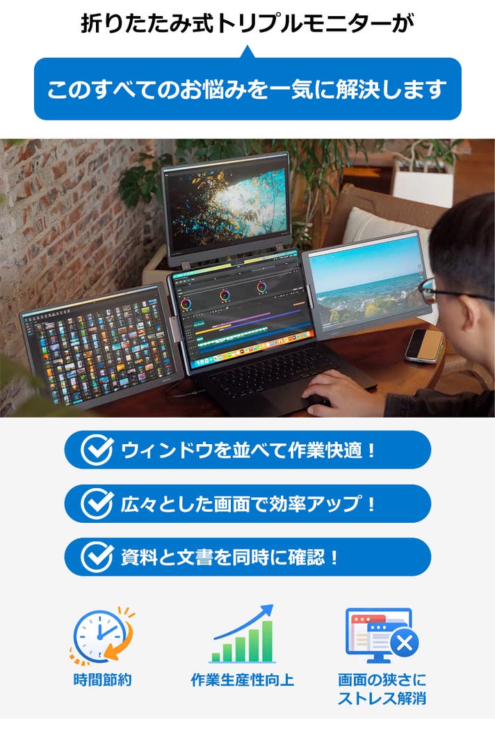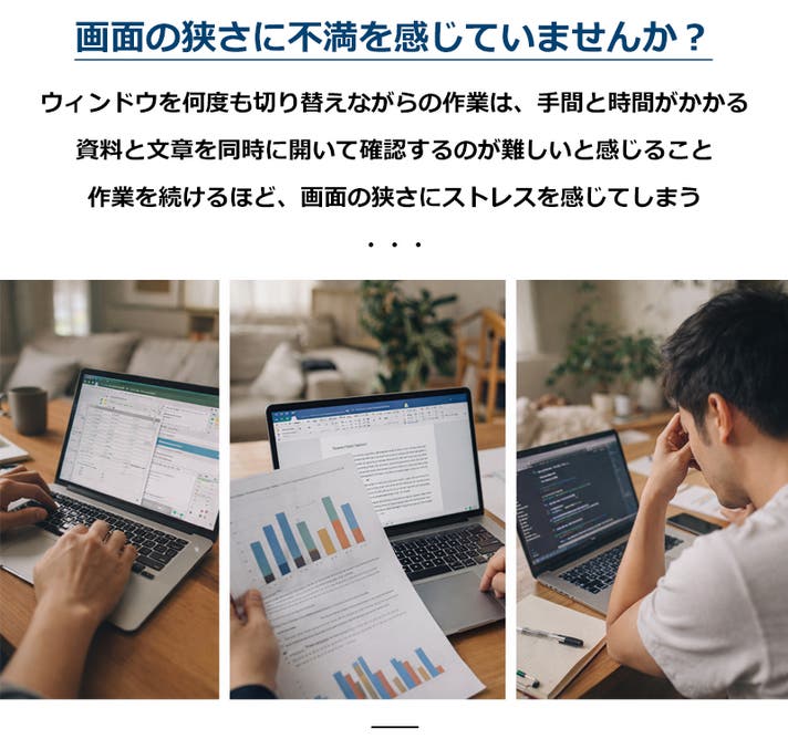 - ノートPC1台の限られた画面環境から、左右・上の3面拡張による立体的なワークスペースへ!