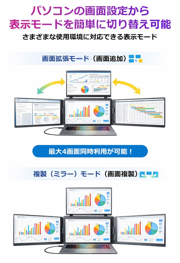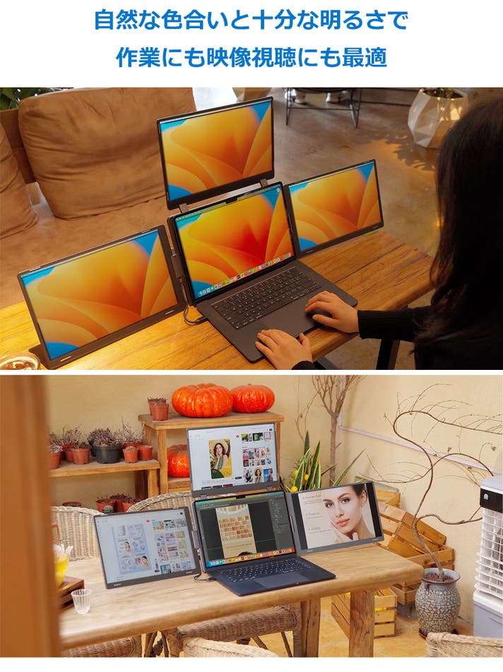 オフィス、自宅、カフェ、出張先など、どこにいても本格的なマルチモニター環境を構築できます。