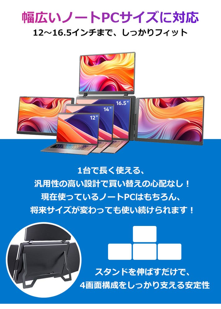 本製品は、約12インチから16.5インチまでの幅広いノートPCサイズに対応しており、画面の大きいビジネスノートまでしっかりフィットする設計のため、買い替え後も長く使い続けることができます。また、背面に内蔵されたスタンドを伸ばして設置するだけで、本体全体をしっかりと支え、4画面構成でも安定した状態を保ちます。