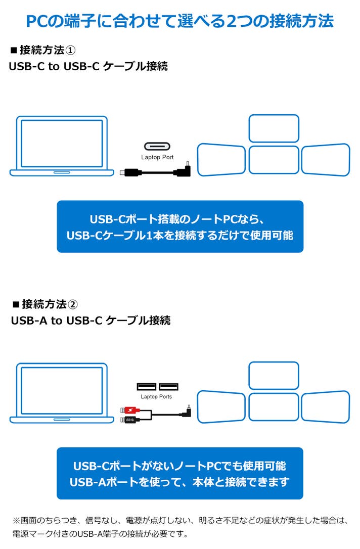 USB-Cポート(映像出力対応)があるノートパソコンなら、USB-Cケーブル1本を挿すだけで接続できます。万が一、USB-Cポートがない、または映像出力に対応していないノートパソコンでも心配なし!USB-Aポート2つを使って接続できる方法もありますので「端子が合わないから使えない」という不安を減らせます。