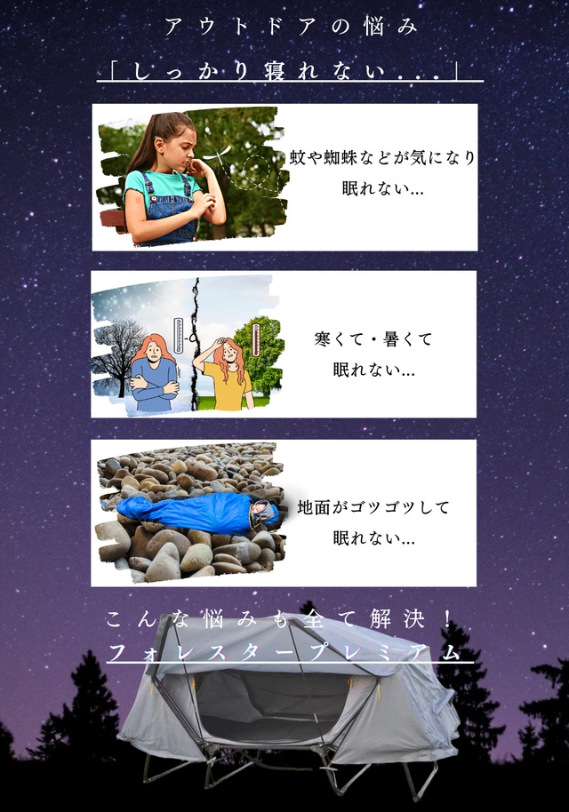 - 虫の地面からの侵入を防ぎ、モスキーネットで蚊などの虫もブロック!大自然での睡眠を満喫!