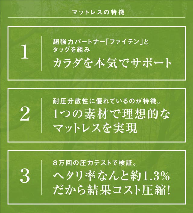 一日頑張ったと思えた時、木々の香り、緑の空間、澄んだ空気の癒され空間を経験をされた方も多いのではないでしょうか? 私もよく軽井沢や八ヶ岳にのんびりしに行きます。あのなんとも言えない『癒し空間』をマットレスで実現できないか、ファイテンとウレタン製造の技術に加えて取り入れたのが日本古来の高貴な森林の香りです。