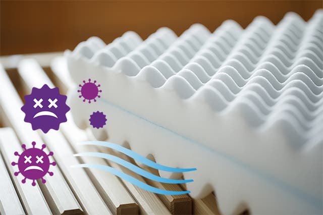 下層となる床との接触面もプロファイルにすることでベッドマットレスのスプリングの役割をもたせ、さらなる体圧分散性の向上に。この仕様はウレタンマットレスの悩みでもある通気性にも対応させた逸品になります。床とウレタンの接触面は空気が流れにくいため、カビやニオイの大敵。これはマットレス購入を検討している多くの方の悩みですが、ファイテンマットレスは床との接触面が山型のプロファイルであることで通気性を確保、衛生的なんです。