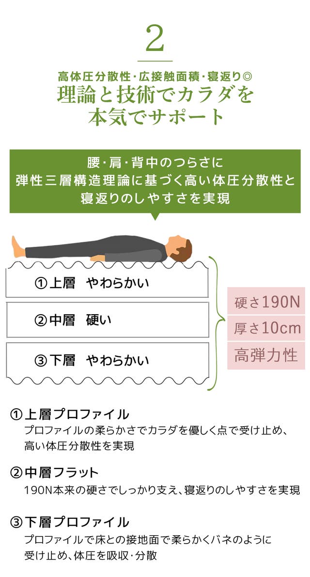 睡眠環境を整えるために、理想的なマットレスの形として提唱されている弾性三層構造理論に基づき、弾性の高い特殊ウレタンを両面プロファイル10cm厚で設計しました。上層となる身体との接触面はプロファイルで柔らかい接触感かつ点で支える高い体圧分散性を実現。中間層はN190の硬さでしっかりと支え寝返りがしやすい仕様。身体との接触面の柔らかさで優しくく受け止め、かつ反発力の高いウレタン素材(高反発マットレス)のため肩や腰の痛みにもつながる底づき感を感じません。