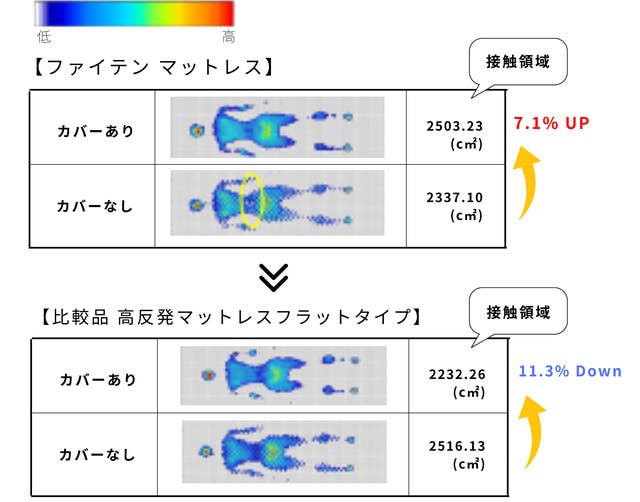 また、ファイテンマットレスのカバーであれば比較品と比べて接触領域差は驚きの18.4%! 仮に7年間、身体の18.4%がマットレスに接触しているかしていないかを想像してみてください。これはかなり大きな差ではないでしょうか?