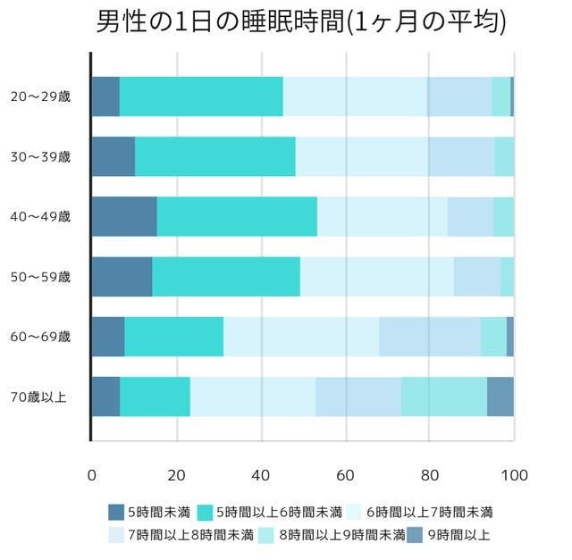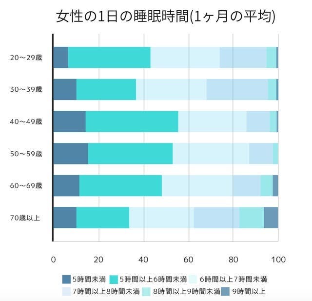 日本人で睡眠6時間未満の割合は40代男性で48.5%、50代男性で44.9%、40代女性で51.8%、50代女性で51.6%というデータがあります。