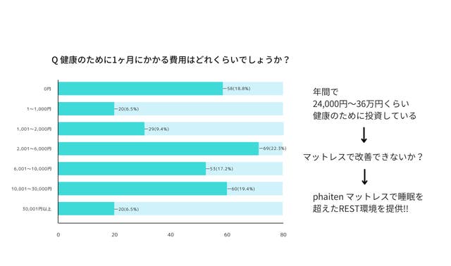 健康にかける費用は年間で2万4000円〜36万円にも上るが、しかし睡眠に投資をしている人はわずか8%しかおらず、つまり睡眠に対して満足しているわけではないが、睡眠環境を改善しようとする人はわずかであることが判明。このことから、