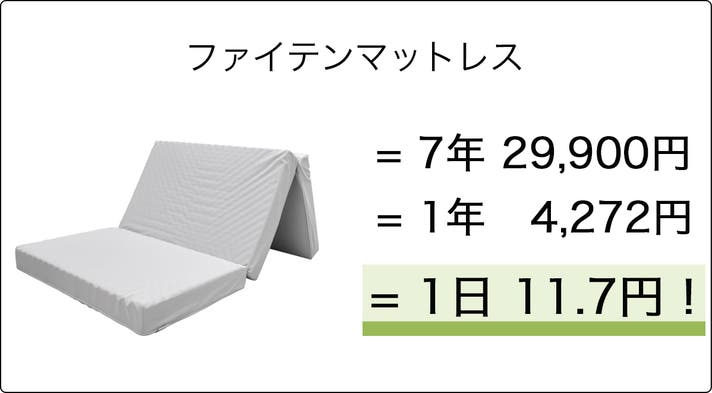ファイテンマットレス「FORESTs」なら1日あたり11.7円(*)。コンディションにこだわった、質の高い睡眠生活へ。日中のパフォーマンスを維持するために1日たった11.7円の投資をしてみませんか? (*FORESTs 三つ折り シングルサイズでの算出)