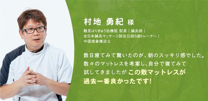 治療家として睡眠には非常に興味があり、寝姿勢や睡眠時間、寝る環境など指導してきました。毎日寝ると、寝起きが良い日と悪い日があると思いますが、この敷マットレスを使用してからは朝のスッキリ感が格段に上がったと実感しています。朝の目覚めがスッキリしているのは快眠の証だと思いますので、ぜひおすすめしたいと思います。