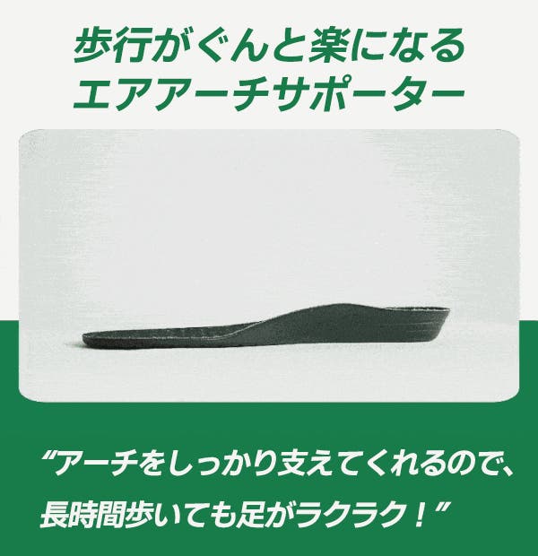 足裏を守るエアアーチボリュームと人間工学に基づいたエアアーチサポーターを一足に集約! インソール専門メーカー FOLAXが直々に開発した自信作です。