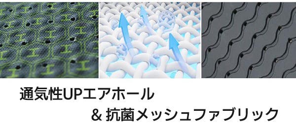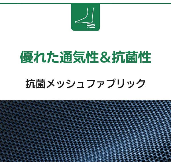 - 通気性と抗菌性に優れた抗菌メッシュを使用。ニオイ菌の繁殖を抑え、快適さをキープ!