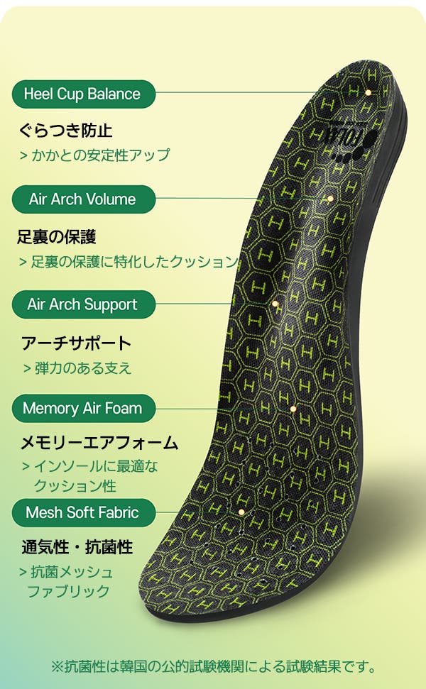 健康な足のために研究・開発されたエアアーチボリュームは、FOLAX独自の技術で、まるでオーダーメイドのような快適なクッション性と弾力性を実現しました。特に足裏の保護に特化した設計で、歩行時のだるさを軽減し、かかとまでしっかりサポートします。