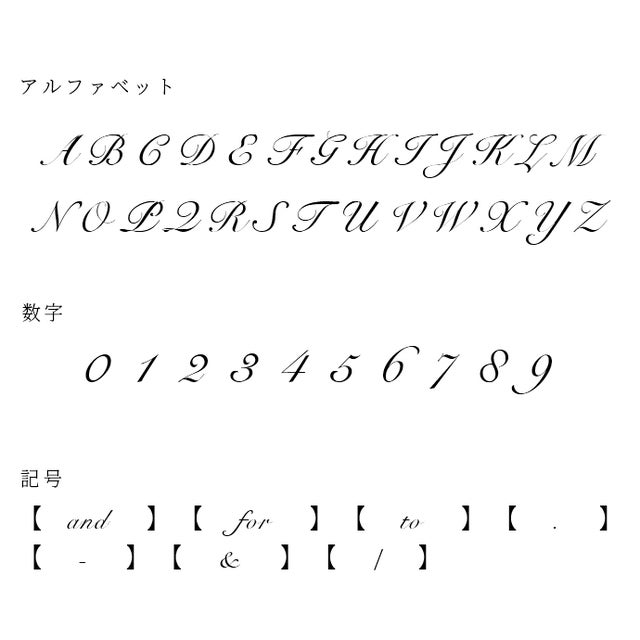 刻印できる内容は、【筆記体のみ】【アルファベット】【数字】【その他記号】になります。