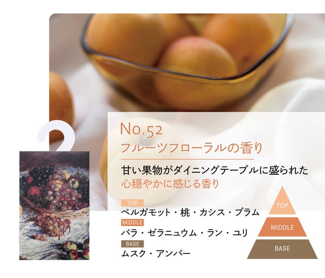 さらに香水のような高級感のある香りをお楽しみいただけますので、合成香料の様な一定の香りではなく、トップノート・ミドルノート・ベースノートと香りの移り変わりも楽しめます。