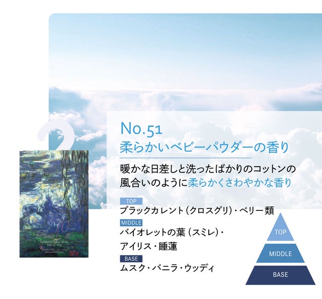 パリセジェムブランドの香りを調合する際には香りのテーマと共にパッケージに描かれているモネの絵からもイメージを広げました。