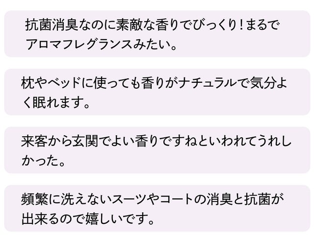繊維製品に吹きかけると、抗菌しながら臭いの元となる雑菌の繁殖を抑制し、天然(植物)由来のラベンダー油やヒノキ油のフラボノイド成分で消臭。