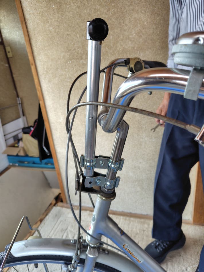 高さについて、自転車そのものに高さ制限はないものの、積載物を載せた際に2メートル以内とする制限があります。「マモルくん」を取り付けた際に、最も高い個所とご自身の身長を比べていただいて2メートルを超えないようにしてください。2メートルを超えそうな場合には、サドルを低めにして、「マモルくん」を下げて、2メートルを超えないように調整ください。以下の写真の例では、最も高い個所が地面から1.7メートルです。