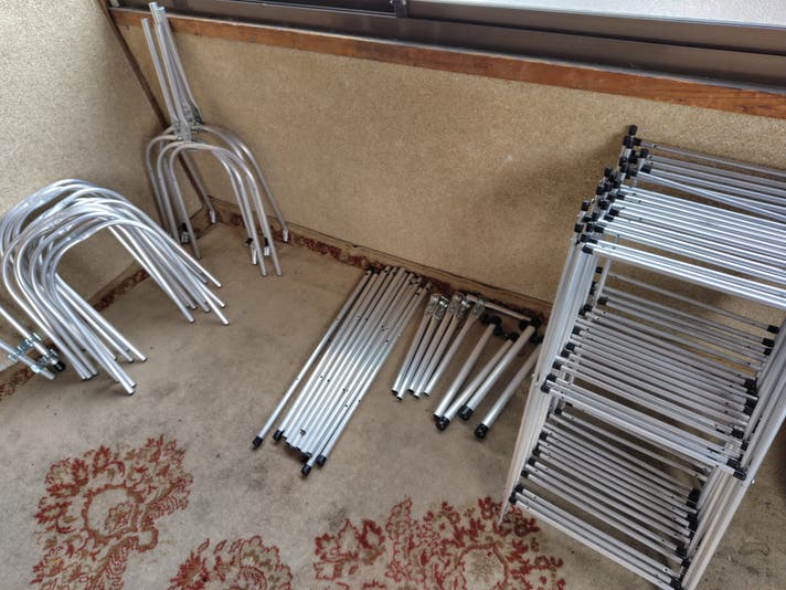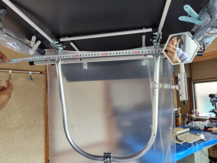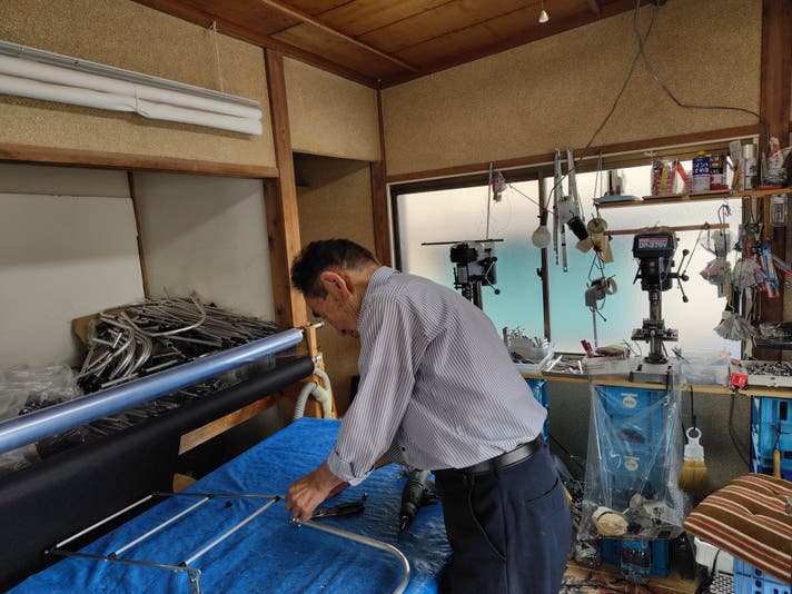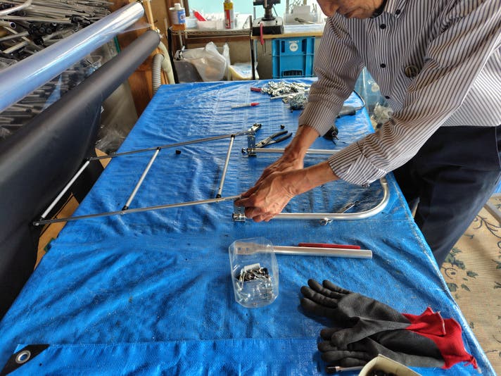 アルミパイプの曲げ工程以外にも、アルミパイプ同士の接続、ポリカーボネートとポリプロピレンの切り出しとアルミフレームへの取り付けのなどの工程もすべて手作りで、お客様のために、一つ一つ心を込めて製作しております。