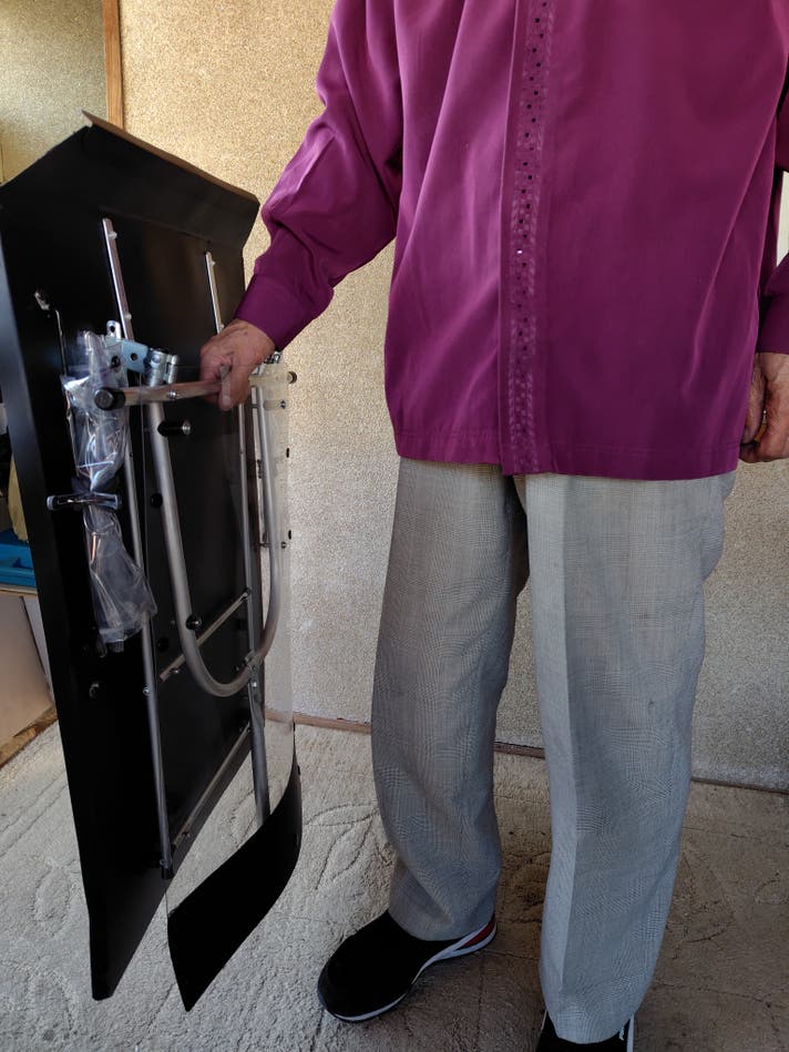 ネジを2か所外すと、「マモルくん」の折り畳みができます。駐輪場では、折り畳んでおけばコンパクトになります。