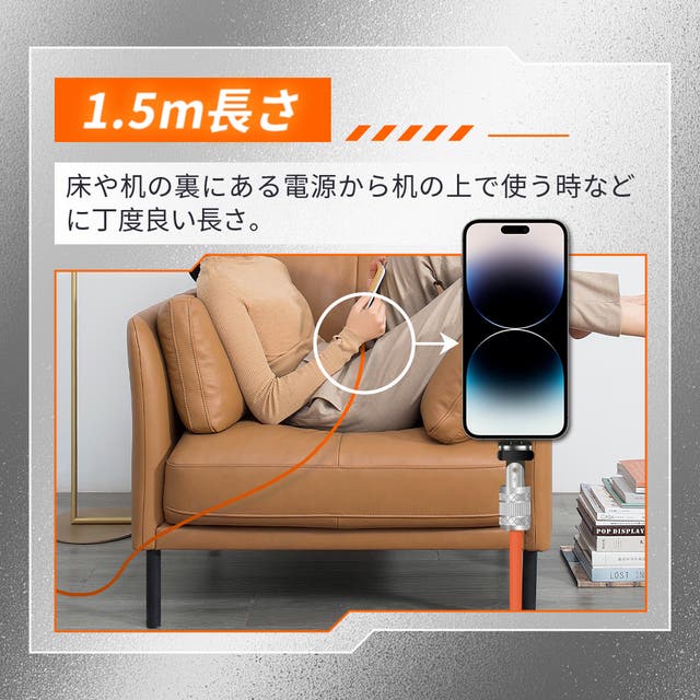 1.5メートル長さにより、デスク周りや屋内用にも幅広く対応!