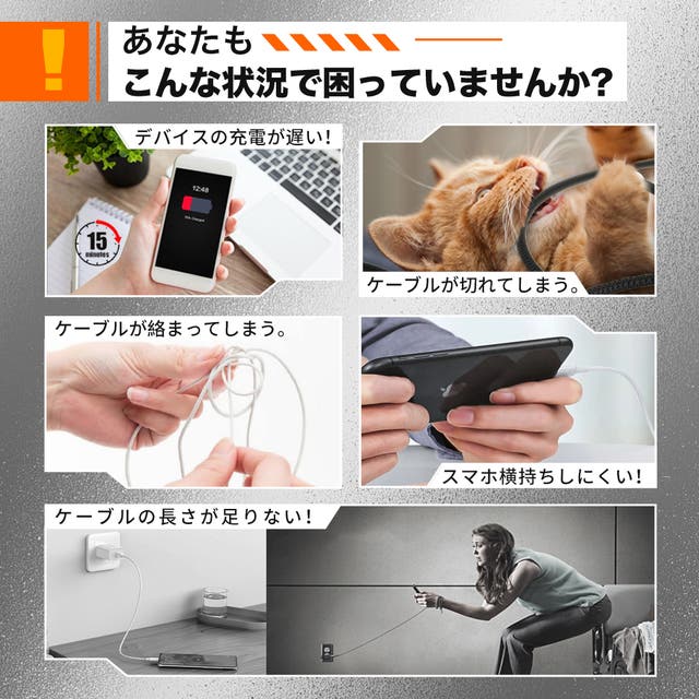 色々な悩みに対して、断線しにくい、コネクタ回転可能、急速充電対応のケーブルを開発されました。