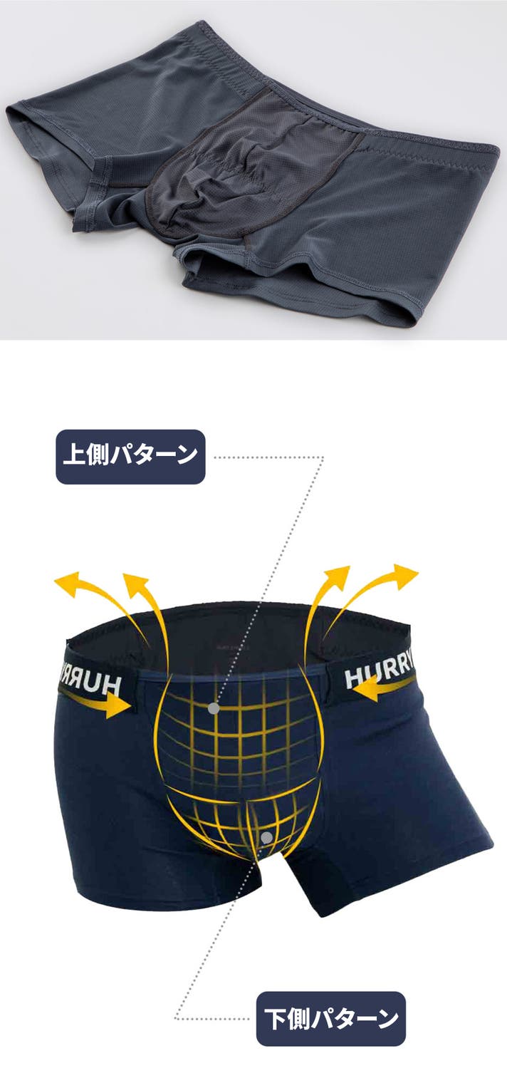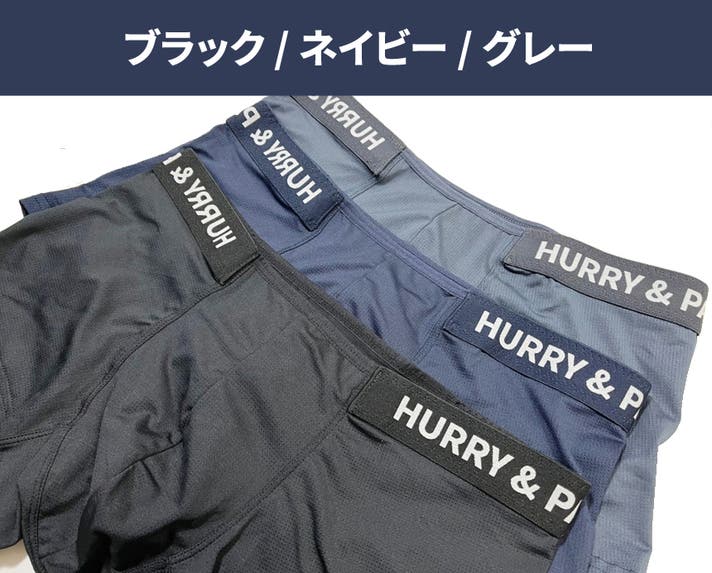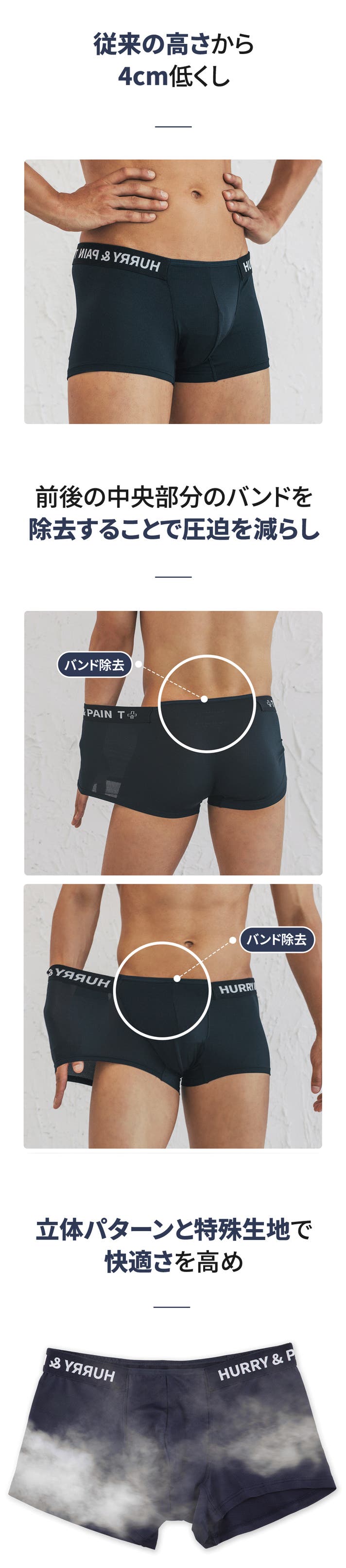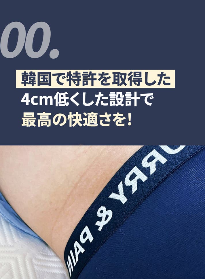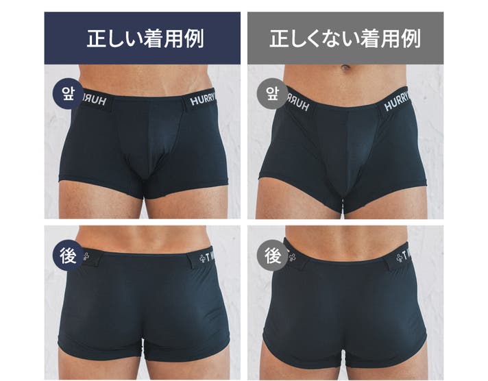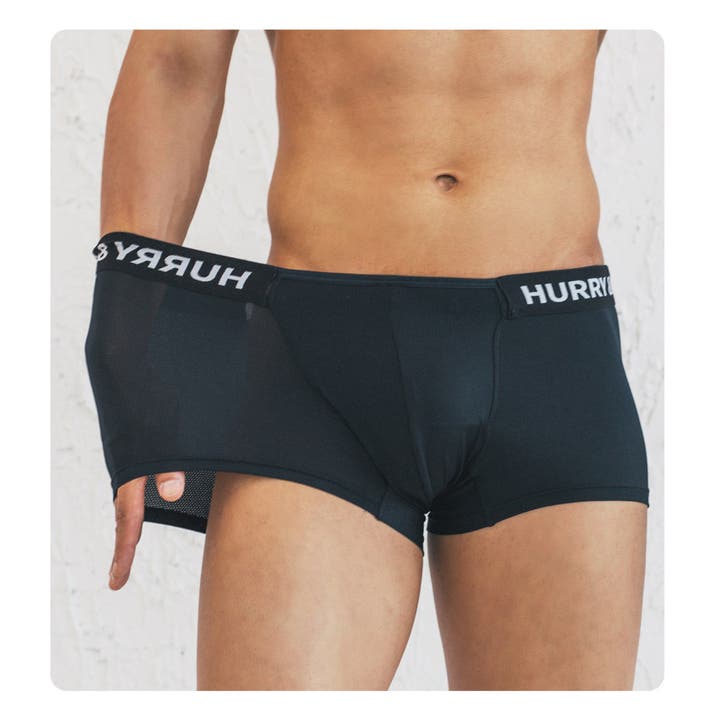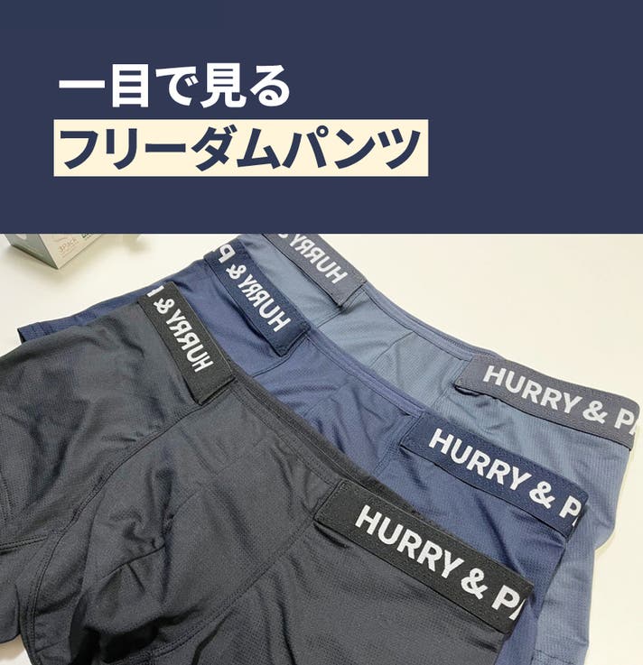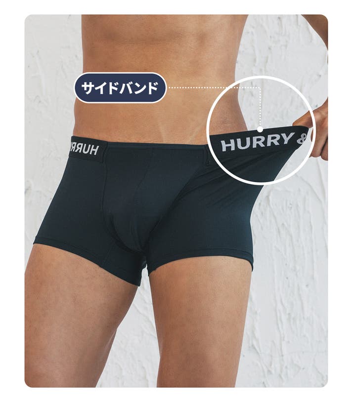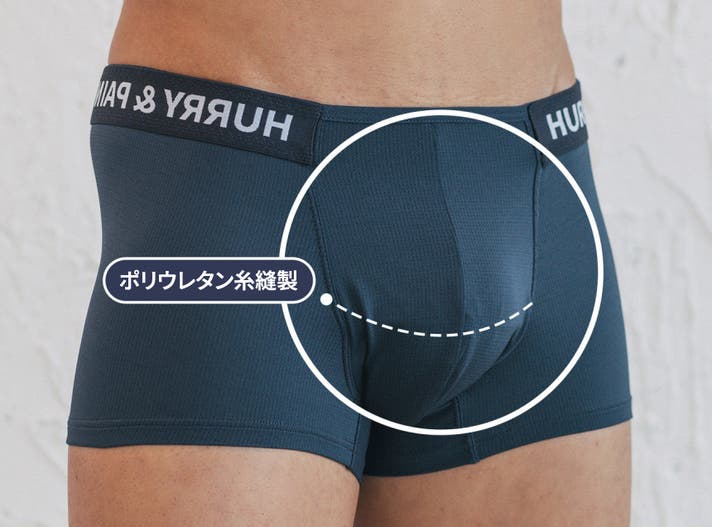 A: ボクサーパンツはフィットによって太ももの上まで届くのが一般的な「ベーシックボクサーパンツ」なら、HURRY&PAINTは特に技術が融合した骨盤にかけて着て、お尻を隠してくれる「ローライズ」系のボクサーパンツです。