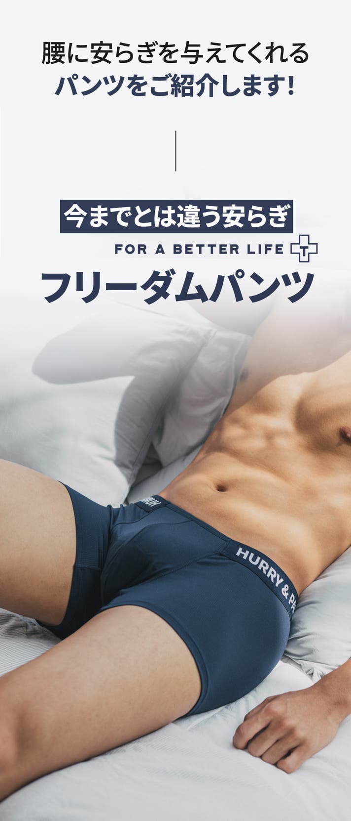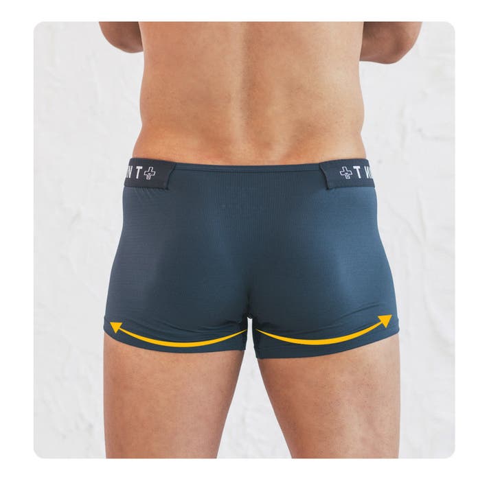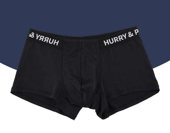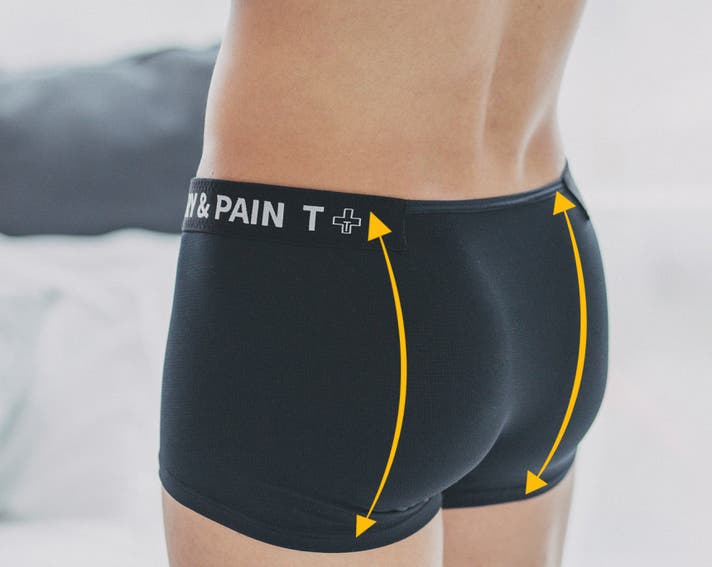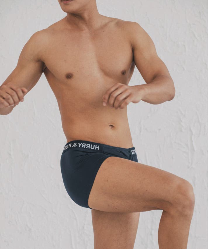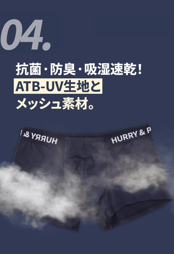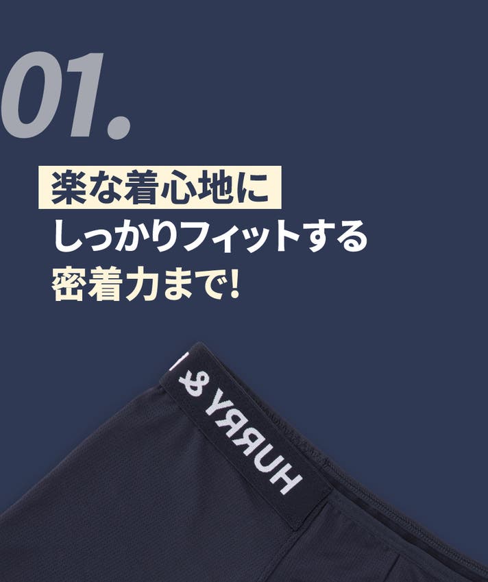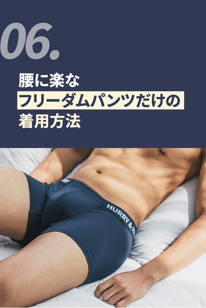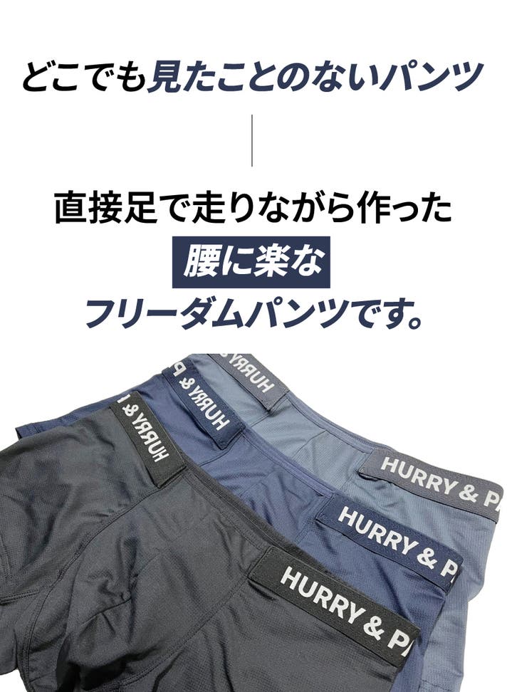A: ボクサーパンツはフィットによって太ももの上まで届くのが一般的な「ベーシックボクサーパンツ」なら、HURRY&PAINTは特に技術が融合した骨盤にかけて着て、お尻を隠してくれる「ローライズ」系のボクサーパンツです。