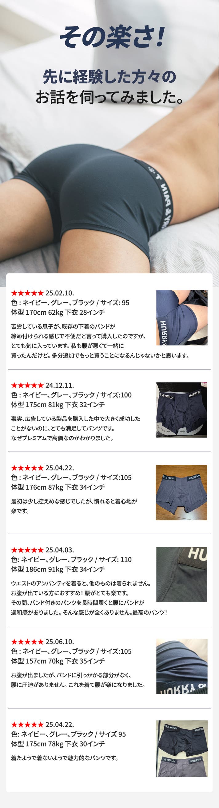 A: HURRY&PAINTが特許登録した技術的ウエストバンドは、従来のバンドより締め付けが少なく、従来のバンドより著しく低いため、下がるという感じがあります。 着用してから1日週程度で違和感がなく快適になります。
