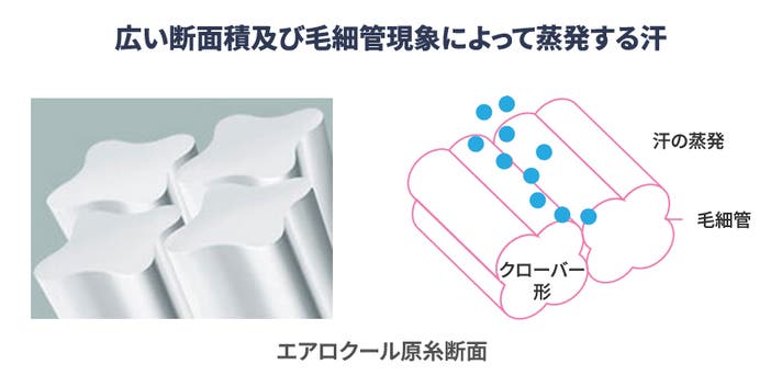 既存のポリエステルに比べて水分と汗を約1.5倍早く吸収して乾燥させる。 この素材を夏用のTシャツに使えば、汗をかいてもTシャツが体にくっつきにくく快適な状態を保つことができます。