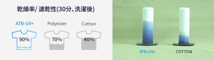ATB-UV+生地は速乾性が90%にもなり、他の生地に比べて速乾性が高いことがわかります。