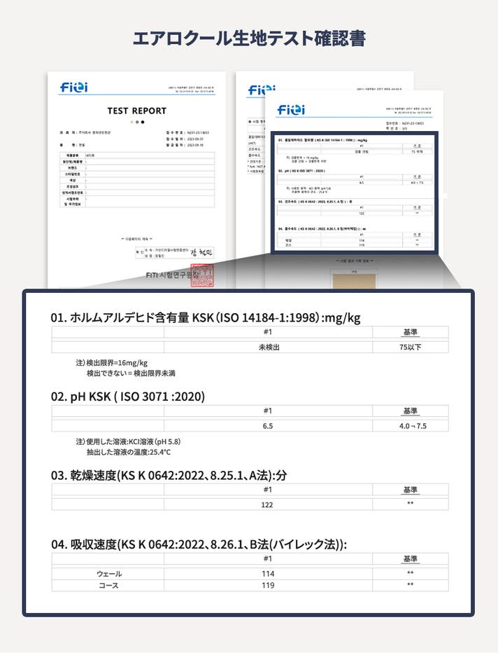 機能性のエアロクール生地は乾燥性と吸収性にも優れていますが、何より人体に着用するパンツで人体に有害な化学成分は生地テストで基準値以下と確認された生地です。