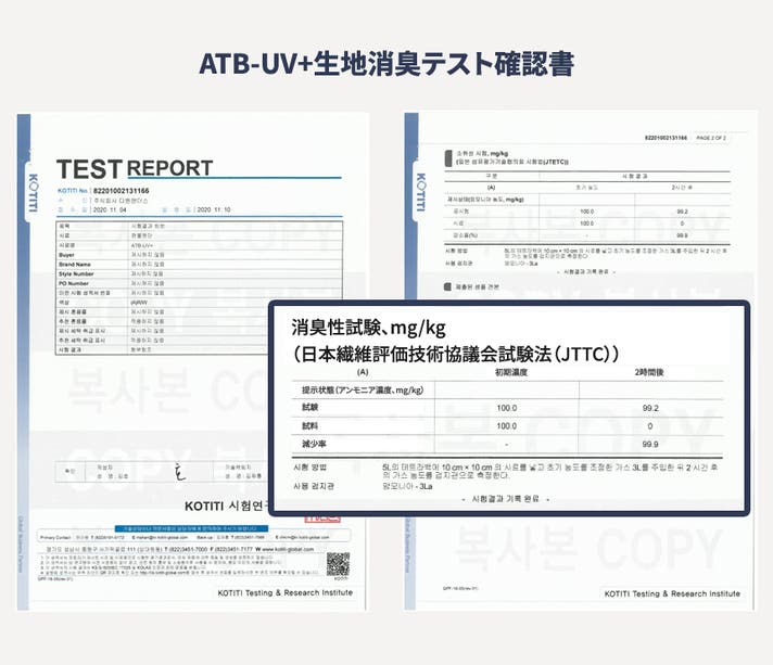 パンツの着用で気になるのが汗と臭いでしょう。 ATB-UV生地は消臭性で優れていることが確認できます。 日本で開発されたテスト方法でテストをして確認することができました。