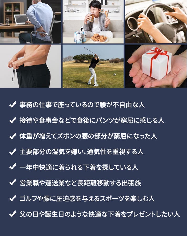 40代以降の男性に多い「お腹や腰周りの圧迫感とパンツの跡」。この悩みを根元から解消しようと開発されたのがこのパンツでした。