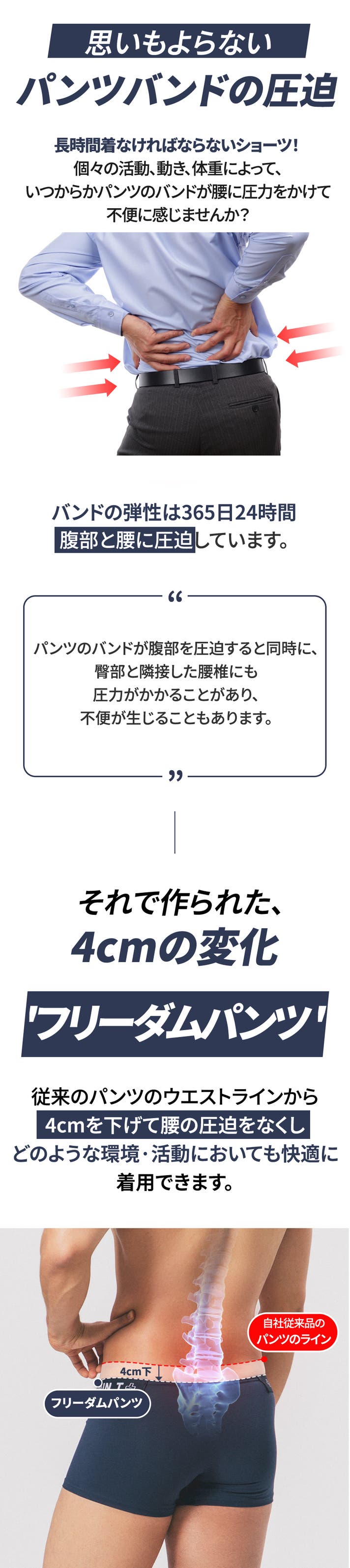 ひたすら腰だけのために研究した結果、4cm下げて腰のラインで腰の圧迫を少なくし、腰の不快感が最も多く発生する腰椎4~5番に圧迫のない楽な密着感で不便な方にも効果的で体重が増加してお腹が出た方にパンツの着用に役立ちます。