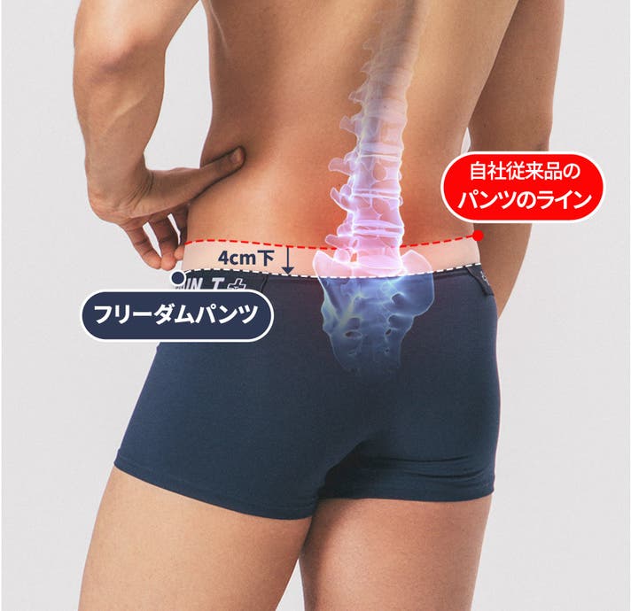 フリーダムパンツは、女性の方が着用するゴム紐のないパンツに着眼して腰を締めるゴム紐バンドを切り取り、腰の不便さが最も多く発生する腰椎4-5番部位をバンドが通らないように設計し、腰椎から4cm降りて前後が断絶した隣のバンドを適用した革新的なデザインを開発することになりました。