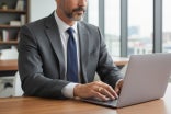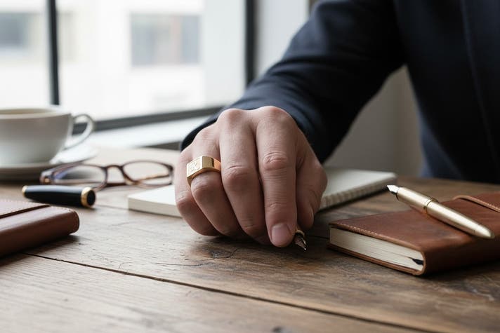 Scene 1(ビジネス・日常): スーツの袖口からさりげなく覗く重厚なリング。独立した記念に社名の頭文字を入れた。派手すぎないため、ビジネスシーンでも手元を引き締めます 。
