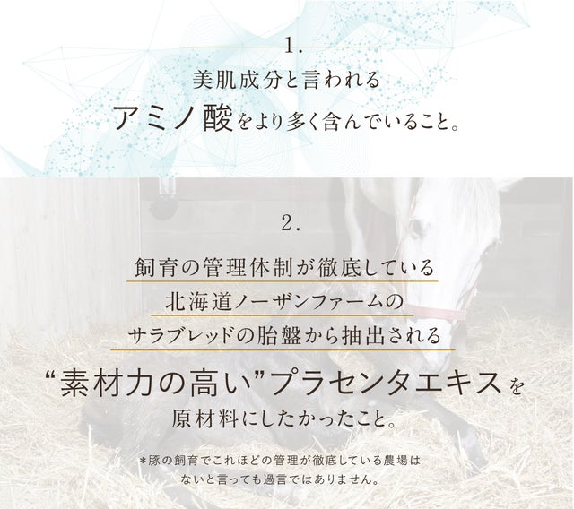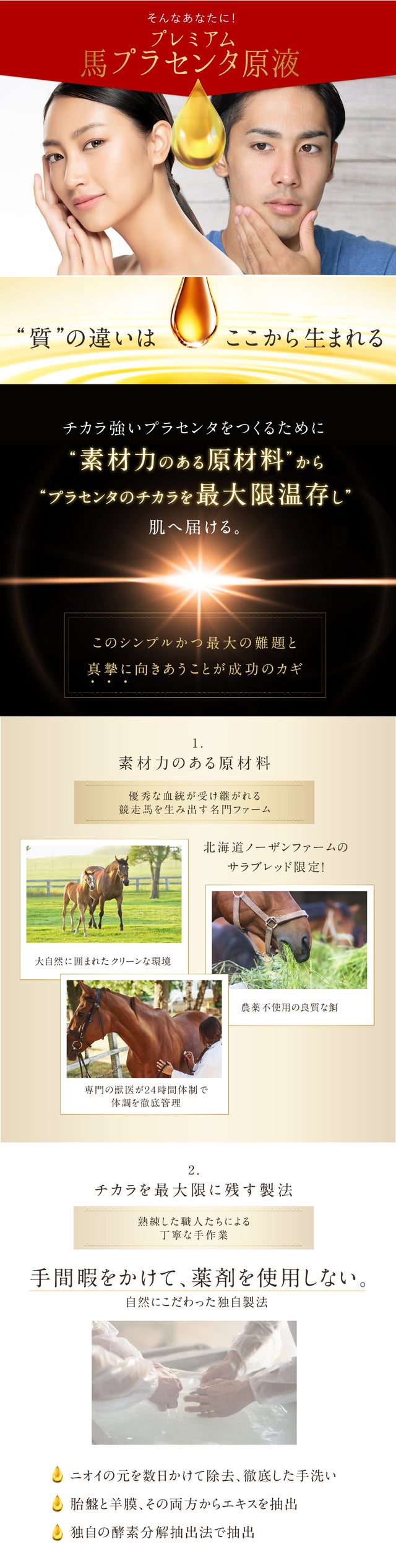 美容師やヘアメイクの仕事では、できるだけお肌に優しいナチュラルコスメを使用しておりましたが、年齢を重ねたお客様やモデルさんの多くは、お肌への優しさと共に、より力強さと結果を求めるニーズが高くパワフルな天然成分として、以前より「馬プラセンタ」に注目。究極のプラセンタ美容液の開発を目指し、ついに完成。